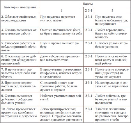 Это значит, что данный темперамент на 35% – холерический, на 30% – сангвинический, на 14% – флегматический и на 21% – меланхолический. Если число положительных ответов по какому‑либо типу темперамента составляет 40% и выше, значит, данный тип темперамента является доминирующим. Методика «Шкала оценок для измерения реактивности ученика» (Я. Стреляу) Инструкция. Определите по 5‑балльной шкале интенсивность каждого из названных свойств. При оценке следует исходить из конкретных, наблюдаемых форм и способов поведения учащегося. – 1 – наименьшая интенсивность данного свойства (полное отсутствие); – 5 – самая высокая интенсивность данного свойства; – 3 – средняя оценка, означает умеренную интенсивность данного свойства. Выбранную цифру нужно обвести кружком. После оценки всех 10 категорий поведения результаты суммируются. Бланк для ответов: