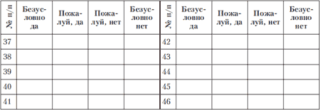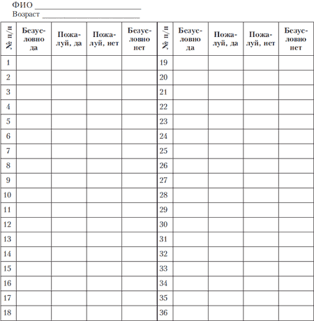 Четырехмодальностный эмоциональный опросник (Л. А. Рабинович) Методика направлена на выявление преобладающих у человека эмоций. Это вопросник, в котором 46 вопросов; на них испытуемые могут дать 4 варианта ответа: «безусловно, да», «пожалуй, да», «пожалуй, нет» и «безусловно, нет». За первый ответ испытуемый получает 4 балла, за второй – 3 балла, за третий – 1 балл, за четвертый – 0. К каждой эмоции (радости, гневу, страху, печали) относится по 12 вопросов (2 вопроса являются одновременно прямыми для одной модальности (радости или печали) и обратными для другой). Процедура анкетирования и вычисления индивидуальных оценок по каждой из модальностей такова. Перед анкетированием испытуемому вручается письменная инструкция, вопросник и бланк для ответов, имеющий 4 графы, соответствующие 4 вариантам ответов. Согласно инструкции, испытуемые должны заносить номера вопросов в те графы бланка ответов, которые им наиболее подходят. Ответы испытуемых оцениваются экспериментатором по 4‑балльной системе. Вычисление индивидуальных оценок по каждой из модальностей состоит в суммировании количества ответов каждого из указанных вариантов, умножении их на то количество баллов, которым данный вариант ответа оценивается, и суммировании баллов всех вариантов ответов. Максимально высокая индивидуальная оценка по каждой из модальностей – 48 баллов, минимальная – 0. Из‑за сложности понимания того, как подсчитывать сумму баллов, засчитываемых при ответах «нет», все вопросы подобного типа переделаны мною с отрицательных ответов на утвердительные. Вопросы этой методики помогают выявлять не собственно эмоции, а настроение, оптимизм или пессимизм, агрессивность и другие характеристики личности, что, собственно, было предопределено целью создания данного опросника: выявить устойчивые эмоциональные переживания обследуемых. Поэтому данную методику в значительной мере можно рассматривать не как выявление в чистом виде переживаемых эмоций (радости, гнева, страха и печали), а как склонность субъекта к оптимистичности или пессимистичности, к позитивному или негативному эмоциональному фону. Инструкция. Перед Вами вопросник и бланк, на котором предусмотрено 4 варианта ответов на указанные вопросы. Ваша задача – ответить на каждый из вопросов. Это делается таким образом: Вы читаете вопрос, выбираете один из 4 предложенных вариантов ответа («безусловно да» «пожалуй, да», «пожалуй, нет», «безусловно нет»), отражающий Ваше мнение. Поставьте крестик в соответствующей графе в листке для ответов. Отвечая на вопрос, каждый раз проверяйте, чтобы номер вопроса совпадал с таким же номером в листке для ответов. Поскольку в разные периоды жизни Вы, возможно, отвечали бы на один и тот же вопрос по‑разному, при ответе исходите из того, что характерно для Вас сейчас, в настоящее время. Дальше Вы так же поступаете со всеми остальными вопросами, всякий раз тщательно обдумывая, какой из 4 вариантов ответа Вам больше всего подходит. Основное условие нашего эксперимента – Ваша добросовестность и искренность. Если Вам непонятна инструкция, прочтите ее еще раз. Итак, начинайте работу! 1. Вы не решитесь пойти ночью в любое страшное место, даже если дело идет на спор? 2. Часто ли у Вас портится настроение, находит уныние, хандра? 3. Можно ли сказать, что Ваше настроение бывает чаще всего 