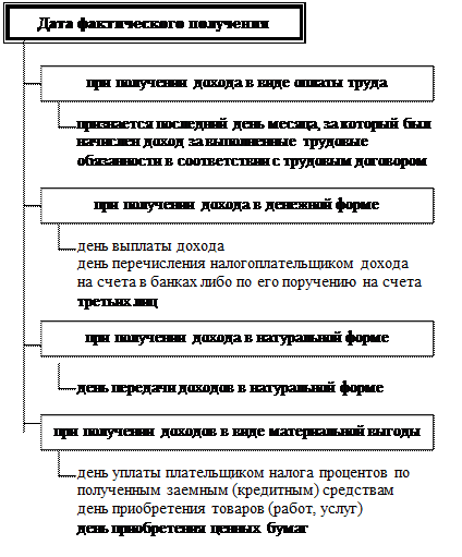 Доходом признается экономическая выгода в денежной или натуральной форме, учитываемая в случае возможности ее оценки и в той мере, в которой такую выгоду можно оценить. Доходы налогоплательщика могут быть отнесены к доходам от источников в Российской Федерации или к доходам от источников за пределами Российской Федерации: · от источников в Российской Федерации и (или) от источников за пределами Российской Федерации - - для физических лиц, являющихся налоговыми резидентами Российской Федерации; · от источников в Российской Федерации - - для физических лиц, не являющихся Налоговыми резидентами Российской Федерации (ст. 209 НК РФ ч. II). Правильность определения налоговой базы за отчетный период зависит от момента фактического получения дохода. Для установления этой даты могут использоваться два метода - кассовый и метод начислений. Применяя кассовый метод (более выгодный для налогоплательщика и поэтому наиболее часто используемый), налогоплательщик ведет учет доходов и расходов исходя из времени приобретения права пользования и распоряжения этими доходами и признания за ними расходов. При кассовом методе учета датой фактического получения дохода считается день выплаты дохода (например, момент получения наличных в кассе), передачи доходов в натуральной форме, уплаты процентов по договору займа (кредитному договору) или приобретения ценных бумаг (п. 1 ст. 223 ч. II НК РФ).