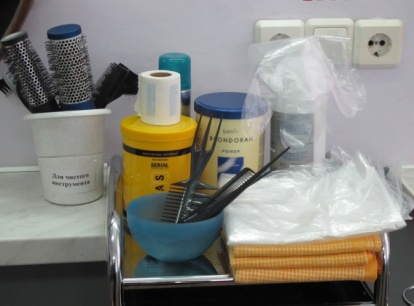 (не металлическая), кисточка, мисочка, мерный стаканчик, зажимы, фольга, воротничок, клеёнчатый пеньюар, перчатки