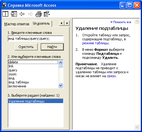 Рис. 1.22. Вкладка Указатель окна Справка Microsoft Access