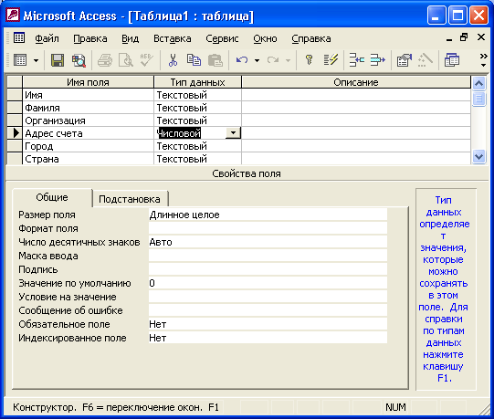 Рис. 2.2. Таблица "Клиенты", открытая в режиме Конструктора Окно таблицы в режиме Конструктора состоит из двух панелей.