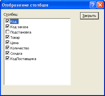 Рис. 2.48.Диалоговое окно Отображение столбцов Как мы уже показали выше, в случае если таблица имеет подчиненную таблицу, по умолчанию в левой части окна появляется столбец отображения подчиненных таблиц. В меню Формат (Format) присутствуют три команды для управления этим столбцом. Чтобы отобразить подчиненные записи для всех записей основной таблицы, необходимо в меню Формат (Format) выбрать команду Подтаблица (Subdatasheet) и в раскрывающемся меню выбрать команду Развернуть все (Expand All). Чтобы скрыть все подчиненные записи, необходимо в меню Формат (Format) выбрать команду Подтаблица (Subdatasheet) и в раскрывающемся меню выбрать команду Свернуть все (Collapse All). При этом важно, чтобы курсор находился на одной из записей основной таблицы, но не подчиненной. Чтобы убрать столбец отображения подчиненных таблиц, необходимо в меню Формат (Format) выбрать команду Подтаблица (Subdatasheet) и в раскрывающемся меню выбрать команду Удалить (Remove). Чтобы вставить столбец отображения подчиненных таблиц, необходимо: