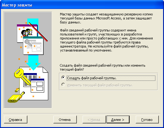 Мастер защиты базы данных на уровне пользователей позволяет создать или изменить существующий файл рабочей группы (рис. 16.4). Рекомендуется создать новый файл рабочей группы и не использовать системный файл рабочей группы System, mdw. Для того чтобы изменить существующий файл рабочей группы (для защиты базы данных), необходимо зарегистрироваться с именем любого пользователя (кроме пользователя Admin), обладающего административными правами доступа к базе данных. Если зарегистрироваться с именем пользователя Admin, который по умолчанию включен в группу Admins и обладает административными правами, с помощью Мастера защиты можно будет только создать новый файл рабочей группы и нельзя будет изменить существующий.