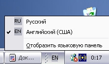 Рис 5.2. Текстовый курсор Найдите текстовый курсор и нажмите любую клавишу на клавиатуре. Соответствующая буква появится на экране, а текстовый курсор переместится на одно место вправо. Нажмите клавишу и курсор передвинется еще правее. Таким образом, добавляются пробелы между словами. Нажимая различные клавиши, введите десять-пятнадцать слов. Обратите внимание, что при достижении правой границы документа WordPad автоматически начнет располагать слова на новой строке. Чтобы перейти к новой строке не доходя до правой границы документа, следует перейти к новому абзацу. Нажмите клавишу, и текстовый курсор переместится к началу следующей строки. Этим действием вы начали новый абзац. Попробуйте ввести несколько абзацев, каждый из которых будет состоять из нескольких предложений. Пока наша работа мало отличается от печати на пишущей машинке но текстовый редактор предоставляет значительно больше возможностей. Для начала познакомимся с особенностями использования клавиатуры компьютера. 5.3. Особенности работы с клавиатурой Вначале остановимся на клавишах, аналог которых есть и на пишущей машинке. Если вам надо ввести прописную букву, нажмите клавишу и, не отпуская ее, нажмите клавишу с нужной буквой после чего отпустите обе клавиши. Для ввода фрагмента текста, состоящего из прописных букв, нажмите клавишу.При этом на клавиатуре зажжется индикатор с такой же надписью. Теперь все вводимые буквы будут прописными. Повторное нажатие клавиши погасит индикатор, после чего будут вводиться строчные буквы. На компьютере можно вводить как русский, так и английский текст. Есть несколько способов выбора языка но мы опишем самый простой. Найдите на рабочем столе панель со значком или и названием соответствующего языка - русский (RU) или английский (EN). Чаще всего эта панель расположена в правом верхнем углу рабочего стола. Она называется панелью языка. Отметим, что возможность выбора того или иного языка определяется при установке Windows. Щелкните мышью на названии языка в панели и рядом появится вспомогательное меню выбора языка (Рис. 5.3).