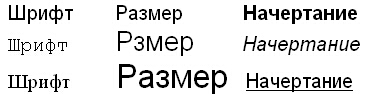 Рис 5.8. Выбор шрифтов Выбор нужного шрифта является важным делом, и мы остановимся на нем подробнее. Рядом с названиями большинства шрифтов можно увидеть значок или. Эти значки обозначают, что данный шрифт будет одинаково хорошо выглядеть на экране и при печати на принтере. Кроме того, такие шрифты позволяют выбрать любой размер, сохраняя при этом высокое качество. Мы рекомендуем использовать только шрифты, отмеченные значками или. Текстовый редактор WordPad добавляет к названию шрифта особенности выбранного языка (Кириллица или Cyrillic). В списке, расположенном в панели форматирования вы можете выбрать нужный язык для выбранного шрифта. Какие же шрифты следует использовать при создании документов? Тут нет точных рекомендаций, однако чаще всего для форматирования заголовков, надписей и выделения небольших фрагментов используется шрифт Arial, а для форматирования основного текста используется Times New Roman. Если вам нужно, чтобы документ напоминал напечатанный на пишущей машинке, следует использовать шрифт Courier New. Для оригинальных надписей можно рекомендовать шрифт Comic Sans Ms. Выбор размера символов очень похож на выбор шрифта. Правее списка шрифтов в панели инструментов находится список размеров. Нажмите на кнопку, и рядом появится перечень возможных размеров. Точно так же, как в списке шрифтов вы можете выбрать любой размер символов. Но что означает десятый размер шрифта? Много это или мало? В текстовых редакторах используется типографская единица измерения, называемая пунктами. Один пункт равен примерно 0,353 миллиметра, соответственно 10 пунктов равно примерно трем с половиной миллиметрам. Высота прописных букв шрифта равна приблизительно трем четвертям указанного размера, а строчных - немного более половины. Для большинства документов используется шрифт размером 12 пунктов. Многостраничные документы, книги и брошюры лучше форматировать шрифтом десятого или одиннадцатого размера. Чтобы часть текста отличалась от остального часто используют различное начертание. Для изменения начертания используют три кнопки на панели форматирования: кнопка или в английской версии используется для выбора полужирного начертания, кнопка, для использования курсива и для подчеркивания. После того, как вы нажмете нужную кнопку, она останется в нажатом состоянии. Повторное нажатие отменит выбранное начертание, и кнопка будет отжата. Если вы одновременно нажмете две или все три кнопки, то будет выбрана комбинация начертания. После того, как вы познакомились с различными вариантами форматирования символов, надо поэкспериментировать с изменением форматирования введенного текста. Выделите весь текст и выберите для него шрифт Times New Roman размером 12. После этого выделите несколько слов и выберите шрифт Arial. Нажмите кнопки и, чтобы слова изменили начертание на полужирный курсив. Попробуйте самостоятельно изменить форматирование различных фрагментов текста. Рассмотрим еще один способ форматирования символов. Установите текстовый курсор в середине текста. При этом ни один фрагмент текста не выделен. Выберите шрифт Courier New размером 24. Внешне ничего не изменилось, но текстовый редактор изменил форматирование для вновь вводимых символов. Введите несколько ело», и вы увидите, что новые символы будут отформатированы указанным шрифтом