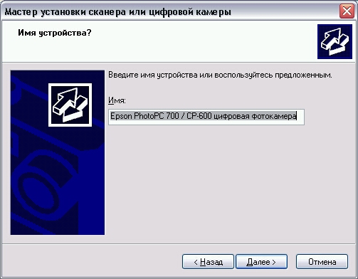 Рис 6.7. Диалоги установки и настройки оборудования Если же вы нашли свое устройство в списке или система обнаружила требуемые файлы на диске, вам следует нажать кнопку Далее (Continue) для перехода к следующему диалогу мастера (Рис. 6.7). В нем вы должны определить, к какому порту подключено ваше устройство. Если вы не уверены, лучше выбрать вариант Автоматический выбор порта (Automatic port select). После выбора порта, нажмите кнопку Далее (Continue). Вы перейдете к предпоследнему диалогу мастера (Рис. 6.8). В этом диалоге вам предлагается назвать устанавливаемое устройство. Под этим именем оно будет присутствовать во всех диалогах, меню и папках, где используются сканеры и цифровые камеры. После ввода имени, нажмите кнопку Далее (Continue), и вы перейдете к завершающему диалогу (Рис. 6.8). В нем ничего вводить не надо, просто нажмите кнопку Готово (Ready). Теперь система установит все необходимое программное обеспечение, и вы сможете работать с новым устройством. В папке Сканеры и камеры (Scanners and cameras) появится новый значок, связанный с ним.