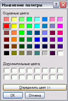 Рис 6.11. Палитра цветов Можно изменять цвета в палитре с помощью команды меню Палитра * Изменить палитру (Colors * Change Colors), однако в подавляющем большинстве случаев предлагаемых цветов хватает для создания простых рисунков. Если же вы захотели поменять один из цветов в палитре, щелкните дважды мышью на этом цвете и на экране появится диалог выбора цвета (Рис. 6.12). Вам предлагается сорок восемь основных цветов. Щелкнув на любом из них мышью и нажав кнопку ОК, вы замените цвет в палитре Paint. Все изменения в палитре потеряются, когда вы завершите работу Paint. При следующем запуске вам вновь будет предложена стандартная палитра.