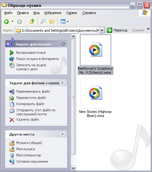 8.1. Работа с папками Мои музыкальные записи и Мои видеозаписи Для работы с видео- и аудиозаписями в Windows ХР предусмотрены специальные папки, которые называются Мои музыкальные записи (My Music) и Мои видеозаписи (My Videos). Это обычные папки на диске вашего компьютера однако при работе с ними Windows предоставляет вам дополнительные возможности. Откройте главное меню и выберите команду Мои музыкальные записи (My Music), чтобы открыть соответствующую папку (Рис. 8.1).