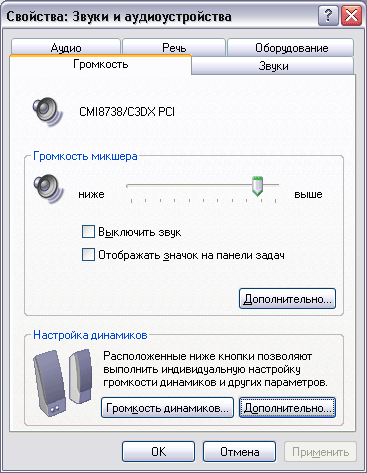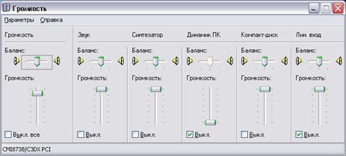 Рис 8.2. Окно регулятора громкости Каждый элемент управления имеет ползунок регулировки громкости и флажок для полного отключения данного устройства. Дополнительно у каждого устройства имеется также еще один горизонтальный ползунок, регулирующий баланс между левым и правым стереоканалами. Самая левая группа элементов управления меняет громкость одновременно для всех устройств. Вертикальный ползунок позволяет одновременно производить регулировку громкости для всех устройств подключенных к компьютеру. Флажок расположенный ниже, позволяет обеззвучить компьютер, отключив все звуки разом.