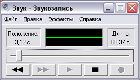 Одновременное отключение звука всех устройств конечно удобно, однако обычно программу регулирования громкости используют не для общей регулировки, а для выборочной настройки отдельных звуковых устройств. Для дополнительной настройки параметров звуковой платы следует выбрать команду меню Параметры * Свойства (Preferences * Options). В появившемся диалоге вы можете самостоятельно выбирать, какими устройствами следует управлять. Делается это путем сброса и установки флажков. Так, по умолчанию, управление микрофоном в окне микшера не отображается. Вы должны самостоятельно установить флажок напротив микрофона в списке устройств, после чего можете включить вход с микрофона и настроить громкость. После этого компьютер будет работать как громкоговоритель. Лучше не включать вход с микрофона чтобы избежать нежелательных шумов. Однако вам может потребоваться записать что-либо с микрофона. Следует знать, что запись и воспроизведение настраивается совершенно независимо. Для настройки воспроизведения следует с помощью переключателя в диалоге выбрать отображение устройств для записи, а не для воспроизведения, после чего нажать кнопку ОК в диалоге. Вы вернетесь к регулировке но теперь вам будет предложено регулировать уровень записи разных источников звука. Если установить флажок в описании микрофона, вы включите его. Ползунком можно отрегулировать уровень записи. При этом если отключено воспроизведение с микрофона в акустических системах не будет слышно никаких звуков. Однако программы работы со звуком будут получать необходимый сигнал с микрофона. Для некоторых звуковых карт окно регулятора громкости может содержать дополнительную кнопку, нажатие на которую открывает окно регулировки тембра и других параметров, допускаемых конкретной звуковой картой. Перемещая ползунки установите требуемый тембр звучания и нажмите кнопку Закрыть (Close). После настройки уровней записи и воспроизведения вы можете закрыть окно программы регулировки громкости нажав кнопку в заголовке окна программы. 8.3.2.Звукозапись Существует большое количество программ для записи звука в файл и последующей обработки звука путем наложения различных эффектов и воспроизведения его через звуковую карту. В состав стандартных программ Windows входит программа Звукозапись (Sound recorder)/ позволяющая решать подобные задачи. Программа Звукозапись (Sound recorder) вызывается из группы программ Стандартные (Accessories) главного меню Windows и позволяет записать звук подаваемый на линейный вход звуковой карты, с микрофона компакт-диска или любого другого источника. Полученную запись можно прослушать. Если качество звучания вас не удовлетворяет можно изменить параметры записи и перезаписать звуковую информацию. Можно провести некоторые операции редактирования и наложения эффектов а затем сохранить полученную композицию в отдельном файле или вставить в качестве фрагмента в различные документы. После запуска программы Звукозапись (Sound recorder) на экране появляется ее рабочее окно содержащее шкалу записи и несколько кнопок напоминающих органы управления обычным магнитофоном (Рис. 8.3). Для записи звука необходимо выполнить ряд подготовительных действий. Прежде всего необходимо определить источник звука. Для этого следует открыть окно программы Регулятор громкости (Volume Control), как это рас