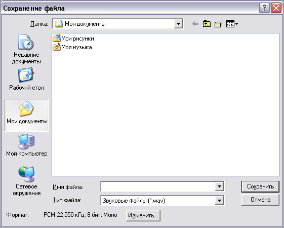 Рис 8.4. Диалог ввода имени При записи фонограмма будет преобразована в выбранный формат и сохранена на диске. Если используются форматы сжатия, то при воспроизведении фонограммы данные будут автоматически распаковываться и вы можете даже не заметить что воспроизводится сжатая фонограмма. Теперь мы готовы начать запись. Чтобы сделать это, следует нажать кнопку в окне программы создания фонограммы, и включить источник звука. Однако перед тем как это сделать лучше запустить программу регулировки уровня звука и убедиться то требуемый источник звука подключен. Если используется микрофон то следует настроить его чувствительность. После настройки микрофона можно включать запись и начинать говорить. Зеленая линия в средней части окна показывает уровень записываемого звука и ее наличие говорит о том, что запись происходит успешно. Остановить запись можно нажав кнопку. По истечении шестидесяти секунд, запись автоматически останавливается. Чтобы далее продолжить запись, необходимо еще раз нажать кнопку. Общая продолжительность записи указывается правее графика звуковой волны. Вы также можете использовать данную программу для воспроизведения как только что записанных, так и ранее записанных и находящихся в файлах звуков. Для воспроизведения используется кнопка. Также программа имеет средства для простейшего редактирования звукозаписей, такие как возможность вырезания участка записи, как до так и после текущей позиции ползунка воспроизведения. Дополняет средства редактирования набор простейших звуковых эффектов которые можно наложить на редактируемую запись. Вы можете изменить громкость и скорость а также наложить эхо или обратить звуковую запись. Все эффекты можно вызвать, выбрав соответствующую команду меню. В заключение работы с фонограммой, ее необходимо сохранить для последующего использования. Выберите команду Файл * Сохранить (File * Save), чтобы открыть соответствующий диалог. В этом диалоге выберите папку для сохранения и имя сохраняемого файла, после чего нажмите кнопку Сохранить (Save). Ваша фонограмма будет сохранена. 8.3.3. Звуковое оформление Windows Практически все современные компьютеры оборудованы звуковой картой и, соответствующим образом настроив Windows, вы можете значительно повысить удобство работы. Звуковое оформление построено по принципу реакции на события. Во время работы вы выполняете определенный набор действий, как с окнами так и со значками на рабочем столе. Каждому такому действию можно сопоставить какой-либо звуковой эффект. Чтобы настроить звуковое сопровождение Windows следует открыть папку Панель управления (Control Panel) с помощью одноименной команды главного меню. По умолчанию данная папка отображается в виде Web-страницы, в которой имеются ссылки на различные группы элементов управления компьютером. В ином режиме в папке расположены значки всех элементов управления без разбиения на группы. Выберите группу Звуки, речь и аудиоустройства (Sounds, Speech and Audio Devices), щелкнув мышью на одноименной ссылке. Вы перейдете к папке, в которой сгруппировано управление аудиоустройствами. Выберите значок с названием Звуки и аудиоустройства (Sounds and Audio Devices). Кстати, если у вас панель управления отображается в классическом виде, то нужный значок вы увидите в общем списке и двойным щелчком мыши на данном значке вы выполни