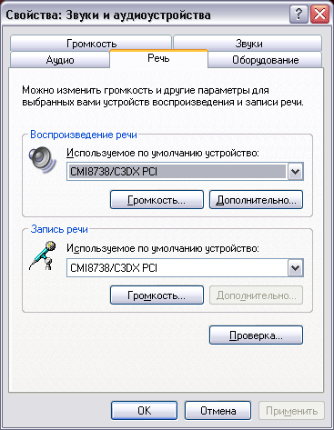 Рис 8.7. Настройка записи и воспроизведения Вкладка содержит две группы элементов управления: для настройки параметров воспроизведения и записи. В каждой из этих групп есть открывающийся список для выбора используемого устройства. По умолчанию для воспроизведения и записи используется звуковая карта, и мы не рекомендуем ничего менять в этих списках. Кроме списка, группы управления содержат ряд кнопок. Кнопка Уровень (Volume) открывает окно программы Регулятор громкости (Volume control) (Рис. 8.4) для регулировки большего числа параметров. Параметры зависят от того, в какой группе элементов управления нажата эта кнопка. Кнопка Дополнительно (Advanced) позволяет настроить параметры качества записи и воспроизведения. Кнопка Тест (Voice Test) позволяет проверить работу вашего оборудования по записи и воспроизведению голоса. Нажмите эту кнопку чтобы запустить мастер проверки звукового оборудования и открыть его первый диалог (Рис. 8.8, слева).