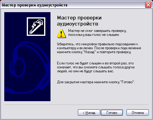 Рис 8.8. Диалоги мастера проверки звука Нажмите кнопку Далее (Next), чтобы начать проверку. Вначале будет проверена возможность записи голоса с микрофона и появится соответствующий диалог (Рис. 8.8, справа). Вам нужно подключить микрофон к вашему компьютеру и прочитать в него текст, который приведен в диалоге. При этом если все нормально, то когда вы говорите, должен меняться индикатор уровня в группе для записи расположенный правее ползунка регулятора. При необходимости настройте уровень записи, перемещая ползунок вниз, чтобы уменьшить уровень и вверх чтобы его увеличить. Нормальным считается уровень когда измеритель во время вашей речи не загорается красным цветом. Допустимыми являются зеленый и желтый цвета. Если при вашей речи измеритель уровня не двигается то следует проверить все соединения и убедиться/ что звуковая карта работает нормально. Если измеритель меняет размер и цвет и вы настроили уровень то все в порядке. Можно продолжить тестирование, для чего следует нажать кнопку Далее (Next). Появится следующий диалог мастера проверки звукового оборудования (Рис. 8.9). Данный мастер предназначен для проверки возможностей воспроизведения звука. Вам также понадобится подключенный к компьютеру микрофон, убедитесь что акустические системы подключены и включены а затем произнесите в микрофон фразу которая написана в диалоге.