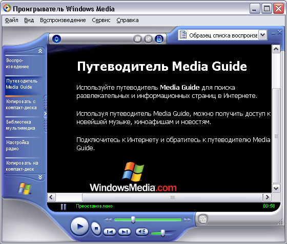 Рис 8.10. Воспроизведение фонограммы Рабочее окно программы, как и все окна Windows, имеет заголовок окна и меню. В правом верхнем углу расположен список воспроизведения. В данном случае он состоит из одного файла, но может содержать и много файлов. Подробнее об этом вы узнаете позже. Ниже меню выводится название композиции, которая в настоящий момент воспроизводится. В левой части окна имеется панель режимов с несколькими кнопками, нажатие которых позволяет выбирать режим работы программы. Далее мы рассмотрим каждый из имеющихся в проигрывателе режимов, а пока лишь отметим, что в данное время проигрыватель находится в режиме воспроизведения, который является основным режимом работы. В нижней части окна проигрывателя располагается панель управления воспроизведением, которая содержит обычные для такого рода программ элементы: кнопку паузы или воспроизведения кнопку полной остановки, регулятор громкости, кнопки перемотки вперед и назад а также ползунок, показывающий текущее положение воспроизведения в файле. Большая кнопка, расположенная в левой части панели, может выглядеть как или. Во время Воспроизведения кнопка имеет вид). Нажатие данной кнопки приостановит воспроизведение, а кнопка изменит свой вид на. Нажав кнопку, вы продолжите воспроизведение с прерванного места. Кнопка, расположенная правее предназначена для прекращения воспроизведения. Если позже вы нажмете кнопку, композиция будет снова воспроизведена с самого начала. С помощью ползунка регулируется громкость звука. Если вы работаете с несколькими звукозаписями или фильмами с помощью кнопок и можно переходить к предыдущему или следующему файлу. Если в списке воспроизведения имеется только один файл данные кнопки недоступны. Для ускоренной перемотки вперед и назад используются кнопки и соответственно. Следует отметить что ускоренная перемотка не работает для некоторых типов файлов. Вы можете перейти к любой части воспроизводимого произведения перетащив мышью ползунок расположенный над кнопками. Если вы просматриваете видеофильм можно остановить воспроизведение и перетащить ползунок в произвольное место чтобы отобразить выбранный кадр. Центральная часть окна предназначена для воспроизведения видеоинформации. При прослушивании аудиозаписей это место обычно используется для отображения различных визуальных эффектов. У вас есть возможность выбрать эффекты с помощью кнопок, расположенных над панелью управления. Далее мы покажем, что внешний вид проигрывателя можно настроить по своему вкусу, поэтому вид окна программы на вашем компьютере может отличаться от вида приведенного в рисунке. Но все равно он будет работать точно так же как и описанный нами. Воспроизведение видео- и аудиофайлов в проигрывателе выполняется так легко что практически не требует особых знаний. Все действия просты и понятны, органы управления похожи на аналогичные органы бытового музыкального центра. Познакомившись с основными элементами окна проигрывателя мультимедийных файлов, рассмотрим некоторые другие, кроме воспроизведения звуковых и видеофайлов, возможности проигрывателя. 8.4.2. Использование Интернета проигрывателем Кроме воспроизведения мультимедийных файлов расположенных на вашем компьютере проигрыватель Windows Media может воспроизводить звуковые и видеопотоки 
