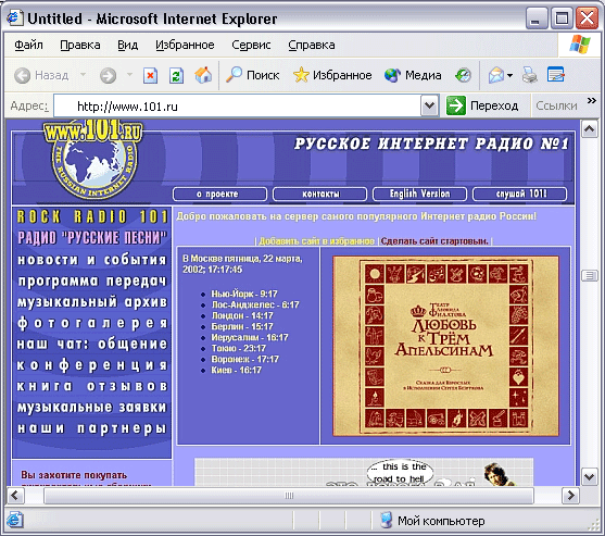 Рис 8.12. Web-страница радиостанции Выбор интересующей вас радиостанции осуществляется переходом по соответствующей ссылке. Щелкните мышью на названии радиостанции, и на экране вашего компьютера появится окно программы обозревателя Интернета (Рис. 8.12). В этом окне вы можете выбрать интересующую вас тему или композицию и прослушать ее вместе с комментариями о ней. При этом окно проигрывателя не будет закрыто и вы продолжите работу с двумя программами одновременно. Для детального знакомства и работы в мире видеофильмов предназначена соответствующая ссылка путеводителя. Щелкните мышью на ярлычке Видео (Video). В рабочем окне опять появится новая страница. Она мало отличается от рассмотренных ранее страниц. Обычно эта страница содержит ссылки на самые популярные новые фильмы, Описание каждого фильма имеет ссылки на трейлеры, так что, перейдя по ней, вы сможете посмотреть на экране вашего компьютера рекламный ролик. В зависимости от качества вашего соединения с Интернетом вы можете выбрать различный размер просматриваемого фильма. Поддержка в Интернете сведений для проигрывателя постоянно расширяется и обновляется. Вы можете найти самую последнюю информацию о ваших любимых исполнителях, увидеть их фотографии, послушать песни и даже познакомиться с их биографией. К сожалению, информация об отечественных исполнителях отсутствует, и вам придется довольствоваться только звездами мировой музыки и кино. Ссылка Развлечения (Entertainment) загружает страницу, содержащую другие ссылки на занимательную и интересную информацию в сети Интернет. Ссылка Стиль жизни (Lifestyles) загружает страницу со ссылками на информацию о различных увлечениях. Ссылка Бизнес (Business) используется, если вы интересуетесь финансовой и деловой информацией. Если вы интересуетесь спортом, то вам будет полезна одноименная ссылка. Для получения самой свежей информации в разных областях используйте ссылку Новости (News), а для того, чтобы увидеть различные интересные моменты жизни в реальном времени вам пригодится ссылка Web-камеры (Webcams). 8.4.3. Поиск и прослушивание радиостанций Рассмотренная ссылка Радио (Radio) путеводителя по медиа в Интернете предлагает вам список радиостанций, который заложили в программу разработчики этого путеводителя. Может случиться что нужной вам станции вы в путеводителе не найдете. Для более удобной работы с радиостанциями в Интернете используется кнопка Настройка радио (Radio Tuner) на панели режимов проигрывателя. Сразу отметим что слушать радио при подключении к Интернету через модем - дорогое и не очень удобное занятие. Если же у вас имеется выделенная линия для работы с Интернетом или вы оплатили не ограниченное по времени подключение а радиоприемник у вас не может принимать интересные станции то рассматриваемая возможность проигрывателя вам может прийтись по вкусу. Кроме того с помощью Интернета можно принимать радиостанции не вещающие в вашем регионе. Щелкните мышью на кнопке Настройка радио (Radio Tuner) на панели режимов чтобы загрузить в программу новую страницу состоящую из двух частей. В левой части находится список известных программе радиостанций которые вещают в Интернете. Вы можете добавлять и удалять их в свой собственный список расположенный в правой части окна если знаете адреса радиостанций вещающих в Интернете. Для этого использ