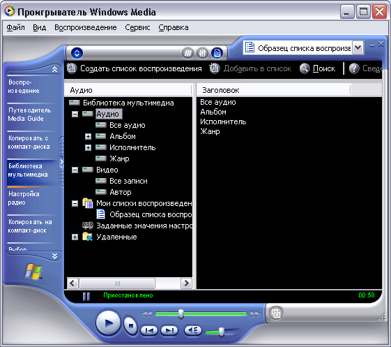 Рис 8.15. Содержимое мультимедийной библиотеки Центральная область рабочего окна разбита на две части. В левой части в виде дерева отображается структура вашей библиотеки а в правой части отображается содержимое выбранных папок из левой части. Такая структура напоминает содержимое окна проводника Windows. Библиотека мультимедиа на вашем компьютере содержит четыре основных папки. Это папки Аудио (Audio), Видео (Video), Настройки радиотюнера (Radio tuner presets) и папка Списки воспроизведения (Playlists). Назначение этих папок понятно из названий. Кроме того, есть специальная папка/ содержащая удаленные вами произведения. Для работы с библиотекой используется панель инструментов, расположенная в верхней части рабочего окна. Эта панель содержит несколько кнопок. Давайте рассмотрим их применение. Нажмите кнопку Поиск (Search). Появится соответствующий диалог (Рис. 8.16).