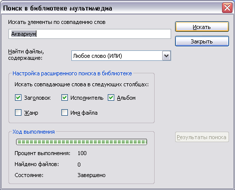 Рис 8.16. Диалог настройки поиска Данное средство предназначено для поиска в библиотеке записей по определенным критериям. Список позволяет выбрать, как должны сочетаться слова во фразе. Набор флажков позволяет осуществить расширенный поиск включая для просмотра имя исполнителя, название альбома, жанр композиции и другие признаки. Установив соответствующий флажок вы включаете соответствующий элемент в поиск. Сбросив флажок вы исключаете элемент из поиска. После того, как параметры поиска установлены, нажмите кнопку Искать (Search). На экране будут отображены результаты поиска (Рис. 8.17). Чтобы оформить результаты поиска в виде списка воспроизведения, нажмите кнопку Результаты (Search result). Поисковый диалог будет закрыт и в левой части окна программы появится список с таким же названием. Вы можете работать с этим списком, как с любым другим, в том числе прослушивать, копировать его на компакт-диски и так далее.