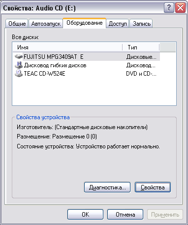 Рис 8.20. Диалоги параметров переносных устройств В данном диалоге в виде списка отображены все обнаруженные программой устройства со сменными носителями информации. Выберите в этом списке переносное устройство и нажмите кнопку Параметры (Properties), чтобы открыть диалог настройки (Рис. 8.20). Этот диалог позволяет выбрать, с каким качеством будет записываться информация. С помощью переключателя выбирается, будет ли использоваться качество, задаваемое при настройке программы, или следует для переносных устройств использовать отдельную настройку. Настройка осуществляется с помощью ползунка, точно так же, как в уже рассмотренном выше случае. После выбора качества копирования, нажмите кнопку ОК, чтобы закрыть диалог. Если вы подключены к Интернету, то нажатие кнопки Добавить (Add) позволит вам отобразить список портативных устройств которые напрямую, без специальных дополнительных программ, поддерживаются проигрывателем, и при необходимости переписать из Интернета необходимую информацию для работы нового устройства. Чтобы закрыть диалог, нажмите кнопку ОК. Теперь после того, как качество записи настроено, нажмите кнопку Копировать музыку (Copy Music). Начнется процесс передачи музыкальной информации на переносное устройство. Передача музыки сопровождается обновлением информации в рабочем окне. После того как вы скопировали выбранные музыкальные файлы в портативное устройство вы можете отключить его от вашего компьютера и прослушивать музыку в любом месте. 8.4.9. Запись музыкальных компакт-дисков В проигрывателе Windows Media поставляемом в составе Windows XP, появилась возможность записывать музыкальные компакт-диски из композиций, хранящихся в вашей музыкальной библиотеке. Если у вас есть устройство для записи компакт-дисков то оно интерпретируется программой как переносное устройство при записи музыки на которое происходит не сжатие информации а наоборот ее распаковка в стандарт Audio-CD. Нажмите кнопку Переносные устройства (Portable Devices) на панели режимов чтобы перейти в соответствующий режим работы. Теперь в правой верхней части рабочего окна в списке портативных устройств следует выбрать устройство для записи компакт-дисков. Теперь настроим параметры записи. Выберите команду меню Сервис* Параметры (Tools * Options), чтобы открыть одноименный диалог. В этом диалоге выберите вкладку Устройства (Devices). Обратите внимание что в списке устройств уже выбрано необходимое устройство. Нажмите кнопку Параметры (Properties) чтобы открыть диалог настройки. Чтобы использовать это устройство для записи следует установить флажок, разрешающий использование. Кроме того при записи на диск система формирует временные файлы поэтому на диске вашего компьютера должно быть не менее 700 мегабайт свободного места. В соответствующем списке укажите диск, на котором есть столько свободного места. Далее следует выбрать скорость записи. Это делается путем выбора элемента в соответствующем открывающемся списке. В этом списке перечислены все скорости, с которыми ваше устройство может записывать информацию. Современные устройства для записи компакт-дисков могут записывать информацию с разными скоростями. Чем выше скорость записи, тем быстрее происходит процесс. Также следует учитывать, что различные заготовки рассчитаны на разную скорость записи. Обычно это указываетс