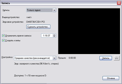 Рис 8.26. Диалог настройки записи Открывающийся список Запись (Record) позволяет выбрать тип записываемого сигнала: Только видео (Video only) Только аудио (Audio Only), Видео и Аудио (Video & Audio). Если программа обнаружила на вашем компьютере устройство для записи видео то в этом списке автоматически будет установлен элемент Видео и Аудио (Video & Audio). Если устройство не обнаружено, то выбранным будет элемент Только аудио (Audio Only). Если и звуковой платы на вашем компьютере не обнаружено то в этом случае программа Windows Movie Maker просто не будет работать. Кнопка Сменить устройство (Change Device) предназначена для выбора другого устройства записи если оно имеется на вашем компьютере. Например изображение вы можете записывать с устройства ввода видео а звук записывать с микрофона или линейного входа звуковой карты. Также вы можете изменить настройки выбранного устройства. Нажмите кнопку Сменить устройство (Change Device) чтобы открыть диалог для выбора устройств (Рис. 8.27).