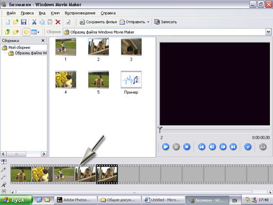 Рис 8.29. Диалог выбора файла Прейдите в папку Мои рисунки (Му Pictures) выберите какой-либо рисунок, и нажмите кнопку Открыть (Open). Начнется процесс формирования клипа из выбранного изображения. По окончании процесса формирования клипа в рабочей области программы Windows Movie Maker появится эскиз, изображающий созданный клип. Отметим, что аналогично можно импортировать любой файл с изображением или с фрагментом видео. Теперь можно приступать к редактированию фильма. Основной задачей программы Windows Movie Maker является создание фильма из различного видео- и фотоматериала. Вы можете создавать фильм из нескольких клипов комбинируя их последовательность. Также вы можете проводить обрезку клипов тем самым удаляя из них ненужные фрагменты. Все клипы, из которых будет состоять фильм вначале нужно перенести на линию раскадровки. Вы можете менять последовательность воспроизведения клипов перетаскивая их с помощью мыши ближе к началу или концу линии раскадровки. Клипы в окончательном варианте фильма будут располагаться друг за другом. Можно изменять начало и окончание воспроизведения клипов чтобы они частично перекрывали друг друга на временной диаграмме. Обратите внимание, что когда клипы перекрывают друг друга, в фильме происходит плавный переход от одного фрагмента к другому. Для редактирования перенесем новый клип на линию раскадровки. Подведите указатель мыши к эскизу клипа, нажмите левую кнопку, мыши и, не отпуская ее, перемещайте указатель мыши к линии раскадровки. Как только указатель попадет на первый слева свободный кадр, отпустите кнопку. Чтобы выбрать клип для редактирования нужно просто щелкнуть на его изображении расположенном на линии раскадровки. Отредактируем клип, полученный нами из картинки. Как вы помните в настройках программы по умолчанию длительность клипа получаемого из картинки, равна пяти секундам. Иногда такая длительность слишком велика. Давайте уменьшим эту длительность путем удаления части клипа. Нажмите кнопку на панели инструментов окна редактирования, чтобы отобразить временную диаграмму. Щелкните мышью на изображении вставленного клипа, чтобы выделить его. С помощью кнопок и на панели инструментов добейтесь того, чтобы интервал времени между соседними рисками временной шкалы соответствовал одной десятой секунды. Так будет удобнее работать. Date: 2015-09-17; view: 533; Нарушение авторских прав |