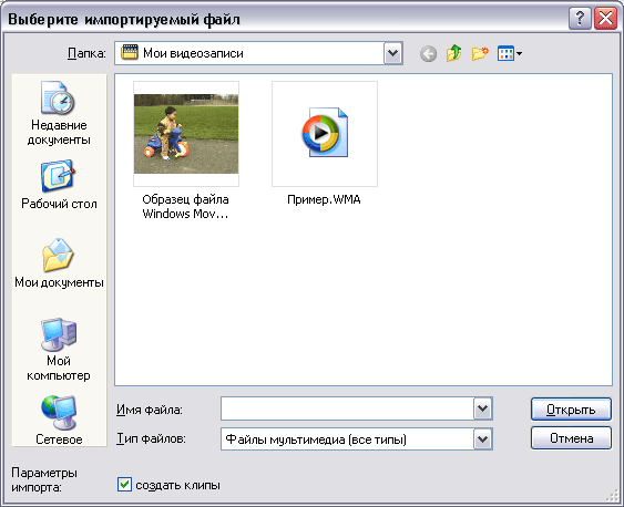 Рис 8.28. Линия раскадровки Чтобы приступить к созданию фильма, подведите указатель мыши к значку, обозначающему записанный вами клип. Нажмите левую кнопку мыши и, не отпуская ее, перемещайте указатель мыши на линию раскадровки. Как только указатель попадет на первый слева кадр линии раскадровки, отпустите кнопку мыши. Таким образом, вы поместили клип в строку редактирования. Аналогично вы можете разместить несколько клипов. В строке редактирования можно задать только последовательность клипов, а их длительность задается с помощью временной диаграммы. Если нажать кнопку на панели инструментов редактирования, линия редактирования превратится во временную диаграмму. В верхней части этой диаграммы отображается временная шкала, позволяющая вам узнать длительность всего фильма и каждого клипа в отдельности. Длина области отображения клипа соответствует его длительности воспроизведений. Вертикальная черта с треугольным маркером на шкале указывает текущее положение в фильме. Каждый клип в диаграмме представлен первым кадром и названием. Значок громкоговорителя в левом нижнем углу кадра указывает что кроме видеопоследовательности в клипе имеется звуковое сопровождение. С помощью кнопок и на панели инструментов вы можете менять масштаб отображения клипов вплоть до покадрового отображения. Обратите внимание что кнопка превратилась в и ее повторное нажатие восстановит Исходный вид линии раскадровки. Теперь поместим в создаваемый фильм какое-нибудь статическое изображение. Нажмите кнопку на панели инструментов редактирования чтобы снова отобразить линию раскадровки. Выберите команду меню Файл * Импорт (File * Import). Появится диалог выбора импортируемого файла (Рис. 8.29) похожий на стандартный диалог открытия файла.