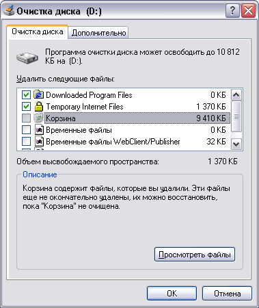 Рис 9.4. Диалог настройки очистки диска Во время работы Windows на диске образуется много файлов, которые создаются для временных целей. Когда на диске много места, количество этих файлов не имеет большого значения. Когда место на диске заканчивается, удаление лишних файлов может помочь в решении проблемы. При просмотре диска подлежащими удалению рассматриваются несколько групп файлов. Прежде всего, это содержимое папки Корзина (Recycle Bin), в которую попадают удаляемые вами файлы, поскольку большинство файлов, попадающих в нее, предназначено для окончательного уничтожения. Далее идет папка Temporary Internet Files (Временные файлы Интернета), содержащая файлы, которые появились на компьютере при работе с Интернетом. Эти файлы нужны для быстрого повторйого просмотра Web-страниц, на которых вы уже побывали, и при их удалении ничего страшного не произойдет. Многие программы при своей работе создают временные файлы для хранения каких-то частей обрабатываемой информации. В Windows предусмотрена специальная папка для таких файлов. Иногда эти файлы не уничтожаются по окончании работы тех программ, которые их использовали. Чтобы удалять такие файлы, предусмотрена специальная группа. Также для очистки предлагается несколько других групп файлов. Чтобы задать удаление групп файлов, следует установить соответствующие флажки диалога. Когда вы нажмете кнопку ОК диалога, начнется процесс очистки. На вопрос о том, действительно ли вы хотите удалить файлы, следует ответить утвердительно, нажав кнопку Да (Yes) открывшегося диалога. Появится диалог с прогресс-индикатором, который иллюстрирует процесс очистки (Рис. 9.5).