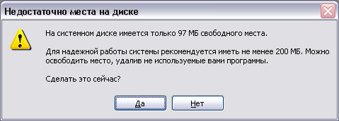 Рис 9.3. Диалог, предупреждающий о малом свободном месте Чтобы запустить очистку диска, где осталось мало места, нажмите кнопку Очистка диска (Disk Cleanup) этого диалога. Если вы хотите запустить программу очистки самостоятельно, то откройте папку Мой компьютер (My Computer) в главном меню Windows. Щелкните правой кнопкой мыши на значке, обозначающем диск, который вы хотите очистить, и во вспомогательном меню выберите команду Свойства (Options). В появившемся диалоге щелкните мышью на ярлычке Общие (General), чтобы выбрать нужную вкладку. На этой вкладке нажмите кнопку Очистка диска (Disk Cleanup), чтобы запустить соответствующую программу. Программа очистки выполняет на указанном диске поиск файлов, которые могут быть удалены автоматически. По окончании просмотра диска на экране появляется диалог, показывающий результаты этой проверки (Рис. 9.4). В списке в центре диалога указаны группы файлов, которые можно удалить, и занимаемое ими место на диске.