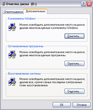Рис 9.6. Дополнительные возможности очистки На этой вкладке вам предлагаются три варианта увеличения свободного места на диске за счет удаления части файлов, используемых системой Windows. Первая группа элементов управления позволяет удалить некоторые компоненты Windows, которые вы сейчас не используете. Чтобы удалить часть компонент Windows, нажмите кнопку Очистить (Clean up). Появится первый диалог мастера компонент Windows. В этом диалоге в качестве списка представлены компоненты системы, которые вы можете удалить. Выбор элемента списка отображает в нижней части диалога комментарий о том, что представляет собой выбранный компонент, также отображается занимаемый этим компонентом объем на диске. Чтобы пометить компонент для удаления, следует установить флажок напротив соответствующего элемента списка. Вторая группа дает возможность удалить ранее установленные программы. Нажатие кнопки Очистить (Clean up) в этой группе элементов управления приведет к появлению диалога Установка/удаление программ (Add/Remove Programs. В данном диалоге также в виде списка представлены установленные в настоящий момент программы. Выбрав программу для удаления, вы увидите занимаемый ею объем на диске. Чтобы удалить программу, нажмите кнопку Удалить (Delete). Будет запущен мастер удаления программ. Подробно об установке и удалении компонент Windows, а также об удалении установленных программ, вы можете прочитать в соответствующей главе этой книги. Третья группа элементов управления позволяет увеличить свободное место на диске путем уменьшения места, занимаемого под свои нужды программой восстановления системы. Более подробно работа программы восстановления системы также будет описана ниже. 9.3. Дефрагментация диска Система хранения данных на жестком диске в системе Windows построена так, что постепенно работа с диском может насколько замедляться. Все дело в принципах работы файловых систем FAT, FAT32 и NTFS, которые используются Windows XP. В этих файловых системах весь диск делится на мелкие части одинакового размера, называемые кластерами. При создании нового файла система Windows помещает в специальной области в начале диска запись, где содержится имя файла и номер первого кластера, куда будет записываться файл. Если файл большой, и одного кластера не хватило, то система ищет первый попавшийся свободный кластер и пишет в него остаток файла. Так продолжается до тех пор, пока весь файл не будет записан на диск. Последний кластер файла помечается особо. Все кластеры, использованные в записи файла, помечаются как занятые. При удалении файла все кластеры помечаются как свободные. Такая; система хорошо работает в самом начале, когда свободные кластеры расположены по порядку. Однако в процессе работы, во время создания и удаления файлов свободные кластеры могут появляться в произвольном месте диска, и в скором времени файлы на Диске становятся фрагментированными. В таком файле часть информации может находиться в начале диска, а часть в конце. Чтение и запись такого файла существенно замедляется, так как диску приходится постоянно перемещать головки из одного места в другое, а это занимает время. Особенно заметно уменьшение скорости работы при фрагментации дисков с файловыми системами FAT и FAT32. Благодаря особенностям построения файловой системы NTFS, уменьшение скорости из-за эффекта фраг
