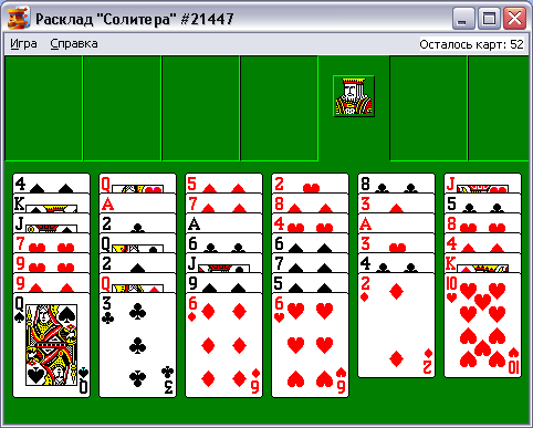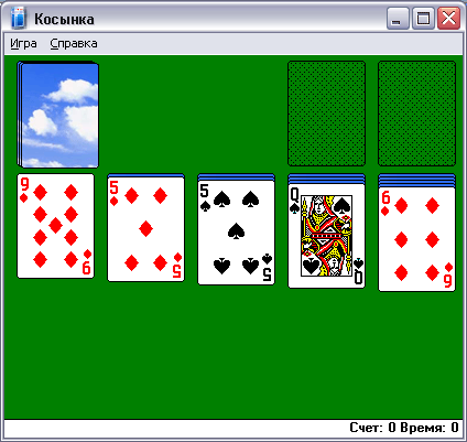 Рис 10.1. Игра Косынка (Solitaire) Перемещать карты между столбцами можно по определенным правилам: карты в столбцах должны располагаться по убыванию, причем цвет соседних карт должен быть разным, например, на черного короля можно положить даму красной масти, затем в этот столбец должен лечь черный валет и так далее. 0.2. Пасьянс Свободная ячейка Данная программа находится в той же группе, что и предыдущий пасьянс и во многом похожа на него. Однако правила этой игры более просты, и считается, что пасьянс Свободная ячейка (Free Cell) всегда сходится. Игровое поле пасьянса (Рис. 10.2) содержит четыре ячейки дома, четыре свободные ячейки и восемь столбцов карт, расположенных лицом вверх. Цель игры состоит в том, чтобы переместить все карты в дом, представляющий собой четыре ячейки, находящиеся в верхнем правом углу экрана. При этом пустые ячейки, расположенные левее дома, используются как промежуточные. Каждая ячейка может содержать только одну карту.