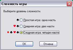 Рис 10.2. Игра Свободная ячейка (Free Cell) Открытые тузы автоматически перемещаются в пустые ячейки дома. Остальные карты необходимо класть поверх тузов по возрастанию: двойку на туза, тройку на двойку и так далее. Чтобы выиграть, следует расположить все карты по возрастанию в четырех ячейках дома, соответствующих четырем мастям. Для перемещения карты нужно щелкнуть на ней мышью, а затем щелкнуть мышью на том месте, куда следует переместить Эту карту. Согласно правилам игры в свободную ячейку можно переместить любую карту, находящуюся внизу столбца. В ячейку дома можно переместить любую карту, находящуюся в свободной ячейке или внизу столбца. Карту можно положить на карту той же масти в порядке возрастания. Карту, находящуюся в свободной ячейке или внизу столбца, можно переместить в низ другого столбца. Карту можно положить на карту другого цвета в следующем порядке: даму на короля, валета на даму. При игре экономно расходуйте свободные ячейки и не занимайте их без необходимости. Для быстрого перемещения карты в свободную ячейку дважды щелкните мышью на этой карте. 10.3. Пасьянс Паук Выберите команду главного меню Другие программы * Стандартные * Игры * Пасьянс Паук (More Programs * Accessories * Games * Spider Solitaire), чтобы запустить новую игру. Появится диалог, предлагающий выбрать сложность игры (Рис. 10.3).