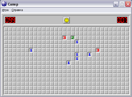 Рис 10.3. Рабочее окно пасьянса Паук (Spider Solitaire) В этом диалоге вы можете с помощью переключателя выбрать сложность игры. Для начала попробуйте самый легкий уровень игры. С помощью переключателя установите уровень игры Легкий (Easy) и нажмите кнопку ОК, чтобы закрыть диалог и начать игру. Появится рабочее окно программы (Рис. 10.3) Цель этой игры состоит в том, чтобы убрать все карты из десяти стопок за наименьшее число ходов. Чтобы убрать карты из стопок, необходимо, перекладывая их из стопки на стопку, сложить последовательность карт одной масти от короля до туза. Как только полная цепочка карт сложена, они пропадают с экрана, тем самым, освобождая место. Попробуйте сыграть в игру самостоятельно, а после завершите работу программы. 10.4. Сапер Если вы любите логические игры, то, возможно, эта игра будет вам интересна. Чтобы запустить игру, выберите команду Сапер (Minesweeper) в меню игр. При этом появится рабочее окно игры (Рис. 10.4). Цель игры - разминировать минное поле как можно быстрее и при этом не подорваться на минах. Игровое поле состоит из счетчика мин, секундомера и минного поля. Мины спрятаны на поле и их не видно. Вы можете открыть любую ячейку, щелкнув на ней мышью.