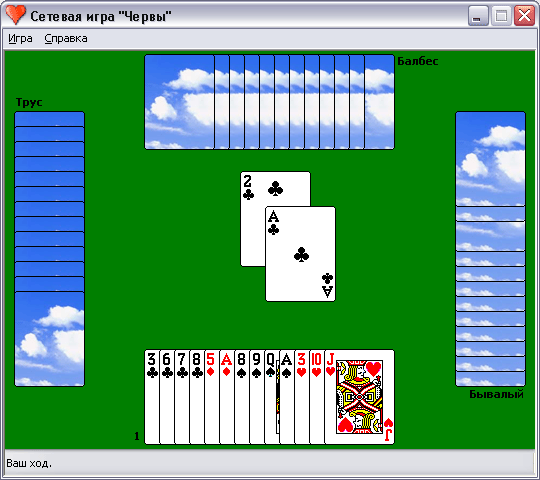 Рис 10.5. Окно программы Пинбол (Pinball) Амортизаторами называются объекты, отбивающие попадающий в них шарик. Мишени отличаются от амортизаторов тем, что не отбивают попадающий в них шарик, а разбиваются. Шарик запускается нажатием клавиши. Манипулируя двумя рычагами, расположенными внизу экрана, игрок должен не дать упасть шарику вниз. Для управления рычагами нажимаются клавиши и, расположенные по краям клавиатуры. Кроме того, подбрасывая шарик с помощью этих рычагов, необходимо управлять полетом шарика, чтобы он попадал в призовые места на игровом поле. Шарик теряется, провалившись между рычагами. Для начала новой игры надо нажать клавишу И. В ходе игры можно заработать неограниченное число дополнительных шариков. Они вступают в игру сразу после потери текущего шарика. 10.6. Червы Выберите команду главного меню Другие программы * Стандартные * Игры * Червы (More Programs * Accessories * Games * Hearts), чтобы запустить игру. Появится диалог, предлагающий вам выбрать себе имя. Если ваш компьютер подключен к сети, то будет доступен переключатель для выбора: хотите ли вы начать новую игру или присоединиться к уже идущей. В поле ввода введите свое имя и нажмите кнопку ОК данного диалога, чтобы начать игру. Появится рабочее окно, представляющее собой карточный стол (Рис. 10.6, справа).