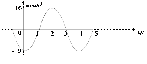 На рисунке представлен график зависимости ускорения от времени для частицы массой 5 г. Найти: 0) циклическую частоту; 1) амплитуду колебаний.