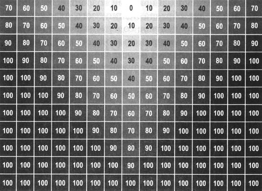 Рис. 3.8 а. По строкам указана величина инфлатона в определённый момент времени с точки зрения внешнего наблюдателя. Чем выше строка, тем более позднему моменту она соответствует. Столбцы соответствуют положению в пространстве. Пузырёк — это такая область пространства, в которой инфляция закончилась из-за уменьшения значения инфлатона. Всё более и более светлые клетки соответствуют величине инфлатона внутри пузырька. С точки зрения внешнего наблюдателя пузырёк всё время увеличивается