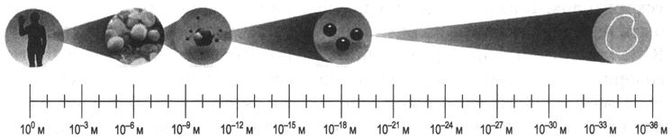 Рис. 4.2. Согласно струнному объяснению устройства природы, на планковских расстояниях фундаментальные составляющие материи имеют вид струноподобных нитей. Однако из-за ограниченности разрешающей способности нашего оборудования мы видим эти струны как точки