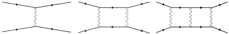 Рис. 5.1. Две частицы (изображённые двумя сплошными линиями слева на каждой диаграмме) взаимодействуют, выстреливая друг в друга разными «пулями» («пули» — это такие частицы-переносчики взаимодействия, изображённые волнистыми линиями), после чего рикошетят вперёд (две сплошные линии справа). Каждая диаграмма даёт вклад в общую вероятность столкновения частиц друг с другом. Вклады с бо́льшим числом пуль становятся всё меньше