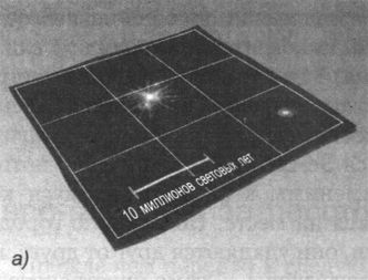 Рис. 6.1. а) По мере приближения к нам свет от удалённой сверхновой рассеивается (мы находимся в галактике в правом нижнем углу карты); б) Пока свет путешествует, Вселенная расширяется, что отражено в легенде космической карты; в) Пока свет дойдёт до нас, он рассеется и его интенсивность упадёт; г) Сравнивая видимую яркость сверхновой с её собственной яркостью, мы измеряем площадь поверхности сферы, по которой свет рассеялся (показана в виде окружности) и, следовательно, находим её радиус. Радиус сферы отражает траекторию светового луча. Его длина — это расстояние между нами и галактикой, где находится сверхновая. Это и есть именно та величина, которую определяют в наблюдениях