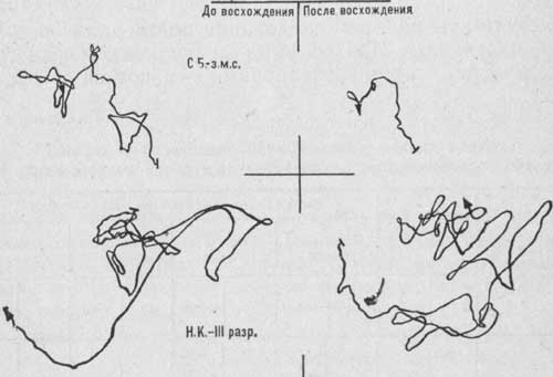Хорошее чувство равновесия очень важно для успешных занятий альпинизмом. От степени его развития зависят быстрота и безопасность движения по моренам, крутым склонам, гребням и особенно при штурме отвесных стен, где преобладают моменты равновесия при статическом положении тела. По данным д-ра Секеларова, альпинизм занимает второе место после акробатики в перечне видов спорта по степени развития статической устойчивости. Проведенные нами исследования с участием 52 альпинистов (1964, 1970 и 1971) до и сразу после стенных восхождений на Уши и пик Еленин в горном массиве Рида и на Врачанских скалах позволили раскрыть изменения, которые происходят в способности сохранять равновесие в результате скального восхождения. В среднем на восхождение тратилось от 1,5 до 3 часов. Мы использовали специальный штатив (кефалограф), к которому была прикреплена горизонтальная плоскость с листом бумаги снизу. Обследуемый становился на нее, ступив одной ногой на горизонтальную площадку. Другая нога и одна рука выставлялись вперед, а глаза закрывались повязкой. Это положение сохранялось 30 сек. Все отклонения тела фиксировались на листе бумаги с помощью вертикально установленного писчика, прикрепленного с помощью обруча к голове альпиниста. При обработке результатов учитывались общая длина кривой равновесия, измеренная специальным прибором, и наибольшее отклонение кривой от начальной точки. Положение геометрического центра равновесия относительно начальной точки (Н) находили посредством определения центра произвольной кривой, разлагая ее на простые фигуры и находя их центры по формулам Xc = SUM(Xi*Li)/L, Yc = SUM(Yi*Li)/L, где Yi - расстояние центра простой фигуры по вертикали, a Xi - в горизонтальном направлении, Li - длина кривой, образующей простую фигуру, L - общая длина кривой. Результаты наших исследований подтвердили результаты, полученные Н. Поповым - с помощью кефалографа Уфлянда, д-ром Секеларовым - с помощью пробы Л. Кротева, а также другие данные о зависимости статической устойчивости от уровня тренированности (см. табл. 13). У альпинистов, имевших хорошую подготовку, после восхождения уменьшились в среднем: общая длина кривой равновесия - на 10,2 см, расстояние геометрического центра равновесия до начальной точки (Н) - на 0,8 см, длина самого большого отклонения кривой от начальной точки (я) -на 5 см. В то же время у слабо подготовленных после восхождения общая длина кривой равновесия увеличилась в среднем на 7,4 см, расстояние геометрического центра равновесия до начальной точки (Н) - на 0,3 см и длина наибольшего отклонения кривой от начальной точки (Н) - на 1,1 см. Таблица 13. Средние данные длины кривой равновесия у хорошо и слабо подготовленных альпинистов дои после восхождения, %