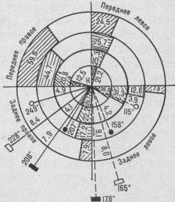 Особенно показательны в этом отношении результаты сравнения данных заслуженного мастера спорта С. Б. и третьеразрядника Н. К., графически изображенные на рис. 1. Видно, что отлично подготовленный С. Б. как до восхождения, так и после него имел значительно меньшую длину кривой равновесия (соответственно 28,8 и 65,5 см). Расстояние геометрического центра равновесия у него также оказалось меньше, чем у Н. К. Это означает, что продолжительность и трудность скального восхождения оказали более сильное воздействие на вестибулярный аппарат слабо подготовленного спортсмена. Представляют интерес данные о распределении общей длины кривой равновесия по направлениям и о положении геометрического центра равновесия, которые могут свидетельствовать о состоянии вестибулярного аппарата после восхождения у двух обследованных групп. Для этого мы разделили кривую двумя взаимно перпендикулярными линиями, пересекающимися в начальной точке (Н) кривой. Таким образом мы получили четыре сектора, соответствующих четырем направлениям относительно положения альпиниста в момент исследования (переднее левое, переднее правое, заднее левое, заднее правое, рис.2). Исследования показали, что наибольший процент кривых у хорошо подготовленных альпинистов как до восхождения, так и после него расположен в переднем правом направлении, а у слабо тренированных - в заднем левом. При этом 45,4% альпинистов после восхождения сохраняют сектор расположения наибольшей длины кривой в таком порядке: 40% - в переднем правом направлении, 30% - в заднем левом, 20% - в переднем левом и 10% - в заднем левом. У 54,6% альпинистов после восхождения геометрический центр равновесия изменил сектор расположения, причем в большинстве случаев (25%) переместился соответственно из заднего правого в заднее левое направление и из переднего левого в заднее правое.