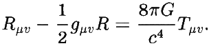 где g — это метрика пространства-времени, Rμν — тензор кривизны Риччи, R — скалярная кривизна, G — константа Ньютона, Tμν — тензор энергии-импульса.
