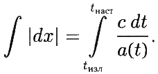 Поясним подготовленному читателю, как вычислить расстояние — сейчас, в момент времени t наст, — которое свет прошёл с момента излучения во время t изл. Мы будем рассматривать модель, в которой пространственная часть пространства-времени является плоской, и поэтому метрика может быть записана в виде ds 2 = c 2 dt 2 − a 2(t) dx 2, где a (t) — это масштабный фактор Вселенной в момент времени t, а c — скорость света. Используемые координаты называются сопутствующими. На образном языке этой главы их можно рассматривать как координаты, соответствующие точкам на статичной карте, а масштабный фактор даёт информацию, приведённую в легенде карты. Траектории светового луча характеризуется тем, что ds 2 = 0 (это эквивалентно тому, что скорость света всегда равна c), откуда следует, что