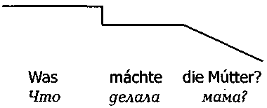 В немецком языке нет таких «волн». Тон голоса относительно ровно снижается от одного ударного слога к другому «ступеньками» и резко падает вниз на последнем ударном слоге. Наш пример немец произнес бы так: