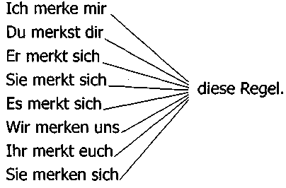 * Иногда возвратное местоимение sich следует употреблять в дательном падеже, на что указывается в словарях — после sich стоит (Dat.). sich (Dat.) die Regel merken запоминать правило