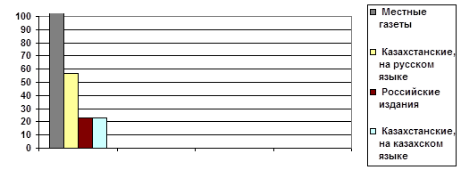 Как свидетельствуют данные, самым активным источником политической информации является телевидение. Из печатных изданий следует отметить местные газеты (городские, областные), которые наиболее читаемы среди респондентов. Так, в ответе на вопрос: “Какие газеты вы читаете?”, в абсолютном большинстве оказались местные газеты (см. диаграмму 2). Данная ситуация довольно точно характеризует ситуацию о роли местных газет. Несмотря на то, что они уступают в оперативности в информационном пространстве местным телевидениям, именно они представляют на своих страницах наиболее подробную информацию. В целом надо отдать должное средствам массовой информации в становлении и формировании характерных основных черт политической культуры студентов, да и всего общества. Наиболее популярны и часто используемые источники, после местных изданий, республиканские (бесспорный лидер газета “Караван”) и российские газеты (среди них вне конкуренций газета “АиФ”). Диаграмма 2. Рейтинг газет у студентов региона
