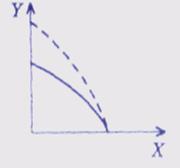 | | КПВ имеет выгнутую форму, так как по мере увеличения производства одной продукции альтернативные затраты для производства дополнительной единицы, выраженные в возможностях производства другой продукции, растут (см. график: перемещение точки Б по кривой) (закон увеличений альтернативной стоимости)
