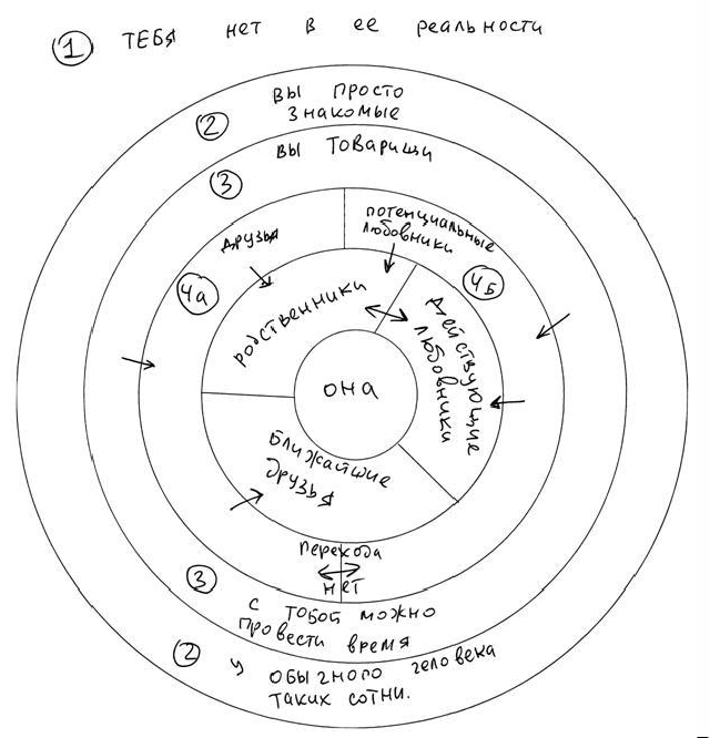 Рис. 5. Стадии построения отношений. Контур Так с чего же все начинается? По большому счету с кота Шредингера. И точно так же, как в эксперименте известного физика не понятно, жив кот или нет. Точно так же на первом этапе совершенно не понятно, существуешь ты или нет. Девушка может догадываться, что где-то там, за таинственным лесом и далеко сквозь пространственные переходы могут существовать некие мужчины, но вас пока никак не свели нос к носу. Тебя нет, понимаешь? Контур Но потом происходит этап первого знакомства. Как понять, что он успешен? План-минимум состоит в том, чтобы тебя узнали на улице и кивнули головой. План максимум — тебя записали в записную книжку в телефоне не как «Дебил, не поднимать!!!», а по имени. То есть тебя помнят и знают. Или хотя бы узнают. Плюсы — ты есть в ее реальности. Минусы: по большому счету ты даже не в отборочном туре. У обычной барышни десятки, если не сотни знакомых парней. Если будешь сидеть, не бликуя на границе ее восприятия, то тебя очень быстро забудут. Считай, что «время жизни» вашего знакомства — ну от силы месяц. Контур Настало время прорываться с боями сквозь плотные линии обороны на следующий круг доступа к телу — давай его условно назовем «товарищи». Что это такое? Тебя уже не только помнят в лицо, с тобой могут провести время. Какая разница между вторым и третьим уровнем доступа? Простая. Знакомым кивают головой, с товарищами начинают говорить за жизнь. С тобой могут встретиться, провести время, поговорить за жизнь, если все друзья заняты. Или если ты позвонишь, поднять трубку и в случае свободного времени согласиться провести его с тобой. Плюсы — с тобой общаются. Минусы: ты на вторых ролях. Вечно быть «на подхвате» так себе идея. Звать в гости тебя будут для компании и массовки, а не как любимого человека. Контур · 4а контур. А вот тут внимание! Очень важная вещь! На четвертом круге доступа уживаются два разных типа людей. Первый — это друзья. Что такое друзья? Это парень, с которым говорят, но не спят. Вернее даже так — женщина с тобой может даже спать в одной постели, но строго без секса. А вместо секса тебе будут говорить про своих парней, рассказывать, где чего и как. И так далее и тому подобное. И целовать только в щечку. В принципе, нет ничего плохого в том, чтобы дружить с девушками — они тебе скажут много, и многим могут быть полезны. С ними можно ходить по магазинам и клубам, советоваться в случае каких-то непонятных ситуациях с твоими женщинами. Единственный минус — из друзей в любовники путь только один. Он заключается в том, чтобы пропасть на полгода или больше, и вернуться новым человеком. Самый лучший способ — записаться и пройти службу в Иностранном Легионе, который во Франции. В любом случае, снова вернувшись, будешь начинать все заново. Причем попасть в друзья очень просто — нужно просто забыть ей показать, что ты ее хочешь, и слишком большое время уделить процессу ухаживания. Как только барышня поймет, что пока ты ей предложишь переспать — она заработает кариес, ты тут же станешь другом. Плюсы — дружить с женщиной это хорошо и приятно. Может знакомить с подругами и консультировать, пить с тобой кофе и появляться в свете. Минусы: к сексу это не ведет. · 4б контур. Второй вариант — это потенциальные любовники. Парни, которые показали, что будут добиваться доступа к телу. Это те ребята, которые на 