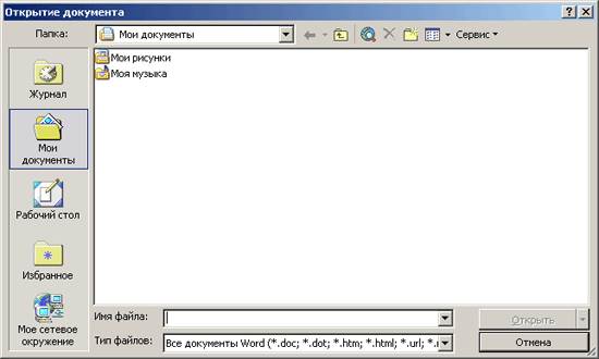 Чтобы просмотреть или отредактировать документ Word или "внести новую запись в базу данных Access, необходимо сначала открыть файл документа, содержащий необходимую информацию. Если файла нет на рабочем столе и вы не помните точное название папки, в котором он хранится, проще всего воспользоваться окном диалога открытия документов. Это окно одинаково для всех приложений Office, а его инструменты позволяют быстро отыскать нужный файл. Давайте изучим способы поиска файла на примере документа Word. Щелчком на кнопке Документ1 - Microsoft Word (Document1 - Microsoft Word) Панели задач активизируйте окно Word Щелкните на пункте Файл (File) строки меню Word и выберите в раскрывшемся подменю пункт Открыть (Open). Появится окно диалога, показанное на рис. 1.3.