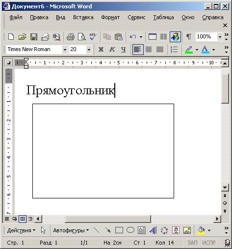 Рис. 6.17. Панель инструментов рисования Теперь давайте нарисуем несколько фигур. Введите в документ текст Это прямоугольник. В панели инструментов Рисование (Drawing) щелкните на кнопке Прямоугольник (Rectangle). Переместите указатель выше и правее введенного текста, нажмите кнопку мыши и растяните диагональ прямоугольника так, чтобы он охватил текст. Предполагалось, что прямоугольник будет играть роль рамки, выделяя текст. Но сам текст пропал. Почему так получилось? Дело в том, что любая фигура имеет границу и внутреннюю область. По умолчанию граница рисуется тонкой черной линией, а внутренняя область закрашивается белым цветом. Эти параметры легки изменить. Щелкните в панели инструментов Рисование (Drawing) на стрелке справа от кнопки Цвет заливки (Fill Color) и в раскрывшейся палитре выберите пункт Нет заливки (No Fill). Прямоугольник станет прозрачным, и текст снова появится на экране. Щелчком на стрелке справа от кнопки 11вет линии (Line Color) раскройте палитру цвета границы фигуры и выберите в ней синий квадрат. Щелкните в той же панели инструментов на кнопке Объем (3D) и в раскрывшейся палитре вариантов объемного оформления выберите второй значок первого ряда. Теперь текст окружен синим объемным прямоугольником (рис. 6.18).