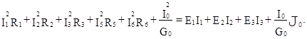 Решив систему, получим I1 =12,26 А; I2 =8,7 А; I3=7,44 А. Теперь вычислим токи в ветвях i 0= I3-I1+J0 = 7,18 А; i 1 = I1-I2 = 3,56 А; i 2 = I2, i 3 = I3 = 7,44 А; i 4 = 0; i 5 = I2-I3 = 1,26 А; i 6= I1 = 12,26 А.